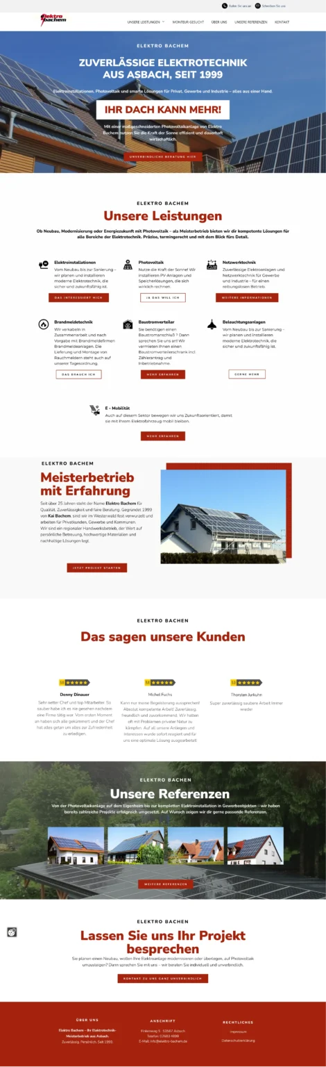 Heute präsentiert sich Elektro Bachem mit einer Website, die Kompetenz, Präzision und Verlässlichkeit ausstrahlt – genau wie das Unternehmen selbst. Die Seite wird regelmäßig gepflegt und erzielt eine deutlich bessere Sichtbarkeit bei Google, insbesondere in Kombination mit „Elektroinstallateur in Asbach“.